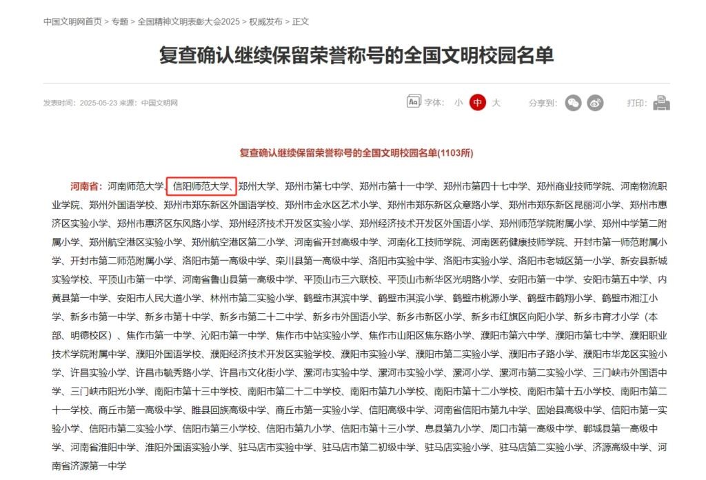 信阳师大新闻网讯 5月23日,中央宣传思想文化工作领导小组发布《关于复查确认继续保留荣誉称号的全国文明城市、文明村镇、文明单位、文明家庭、文明校园的通报》,经复查确认,我校蝉联“全国文明校园”荣誉称号。