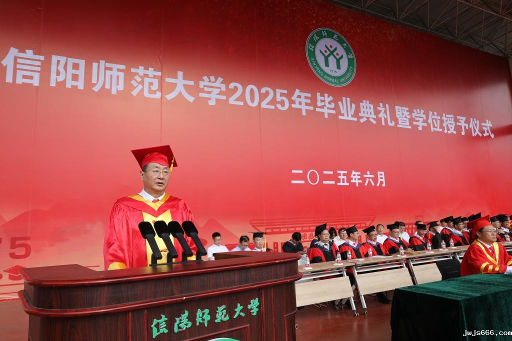 王娟在主持讲话中希望毕业生牢记师长嘱咐,秉承校训精神,永葆赤子情怀,在时代舞台上绽放才华,在壮丽山河中建功立业,以奋进之笔续写信阳师大人的辉煌篇章。