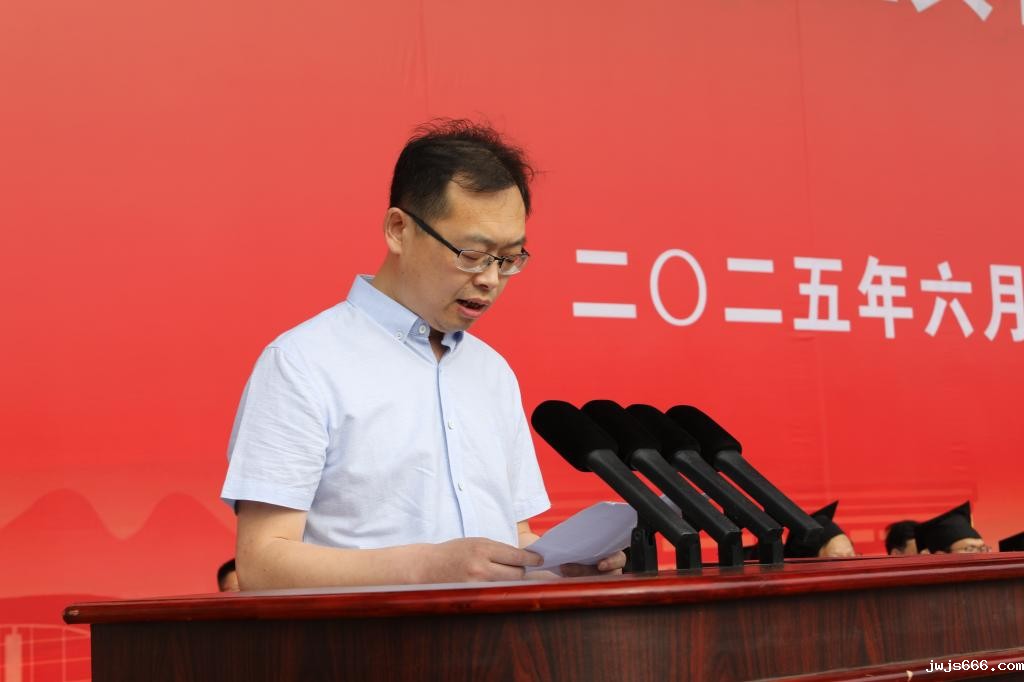 王文鹏指出,新时代江河壮丽、恢宏浩荡,新征程繁花似锦、前途坦荡。站在“现在”与“未来”的交汇点上,在临别之际,对毕业生们提出殷殷嘱托。他嘱托同学们“以信仰为炬,照亮理想星空”。面对新的人生征程,找准人生航向,拥有大担当、大情怀、大境界,坚定为理想矢志奋斗的信念,在祖国最需要的地方和自己的工作岗位上绽放青春华彩,让马克思主义真理的光芒永远照亮前行的道路。他嘱托同学们“以时代为船,高扬奋进风帆”。身处伟大时代的浪潮之中,把稳时代航舵,担当时代使命,持续在知识的海洋中遨游,在实践的熔炉中锤炼,以青春之我、奋斗之我,与时代同步伐、与人民共命运,成为推动时代发展、社会进步的坚实力量。他嘱托同学们“以实干为基,耕耘发展沃土”。在社会熔炉中锻造过硬本领,在默默的坚守里持续努力,实现自我超越,以精益求精的工匠精神雕琢品质,敢于突破、苦干实干,让生命在实干中绽放出最耀眼的光芒。他嘱托同学们“以德行立身,走好人生长路”。以坚定信念守护内心的纯粹,以清醒头脑恪守道德的底线,用感恩之心拥抱父母无私的养育,以崇敬之情铭记师长谆谆的教诲,以真诚之意珍惜同窗深厚的情谊。让道德的清泉浸润心灵,让文化的甘霖滋养灵魂,以高尚品德铸就人生的高度,以宏大情怀拓展生命的广度,构建起既有思想深度、又充满人性温度的精神家园,在美好人生征途上行稳致远。
