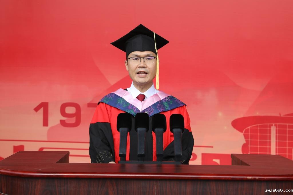 校党委书记王文鹏教授以《五秩荣光映前路肇启新篇待君书》为题发表了热情洋溢的致辞,向全体毕业生送上最美好的祝福。王文鹏指出,毕业如期而至,未来如约而来。我们在几年前的初秋相遇,风华正茂的你们以优良学风汲取新知,锤炼品格,求真务实,砥砺前行,用青春汗水铸就了光荣与梦想,以拼搏奋进赢得了认可和赞誉。毕业生中有1388人考取硕士研究生、37人继续读博深造、811人成功专升本,特别是9号楼108等20个学生宿舍全员考研上岸,成为“学霸宿舍”,一大批学生在全国大学生数学建模竞赛、“强网杯”全国网络安全挑战赛、全国大学生职业规划大赛、全国“田家炳杯”教学技能大赛等各级各类专业竞赛中获奖,众多优秀学生荣获“文明学生”“校园明星”“自强之星”等荣誉称号。你们以砥砺之姿跨过求学路上的荆棘泥泞,手握饱蘸热血的奋斗之笔,勾勒出了属于自己的鎏金画卷。