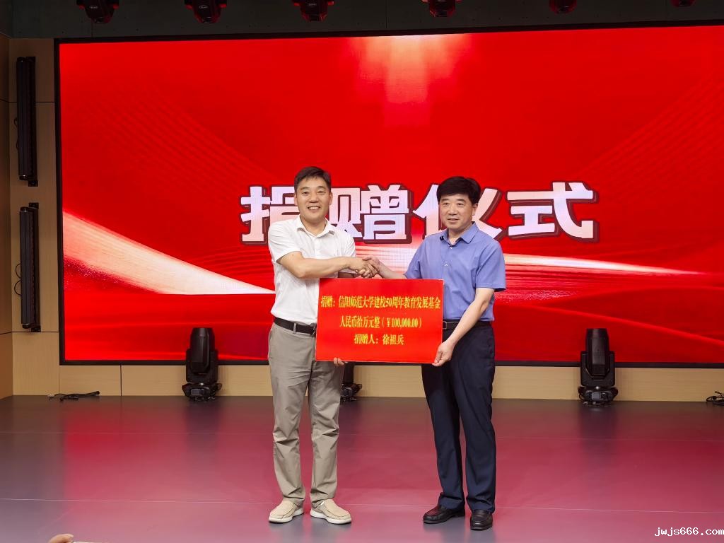 捐赠仪式上,江玉安介绍了学校近年来在学科建设、人才培养和社会服务等方面取得的成就以及50周年校庆的筹备情况。他表示,校友是学校最宝贵的财富,徐祖兵校友的捐赠不仅体现了对母校的深情厚谊,更展现了信阳师大人饮水思源、回馈母校的优良传统。50周年校庆在即,诚挚邀请海内外校友重返母校,共襄盛举,携手谱写新时代高等教育发展的新篇章。