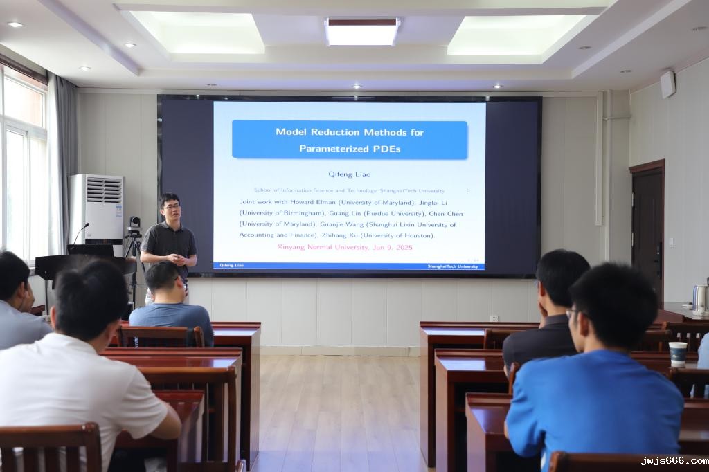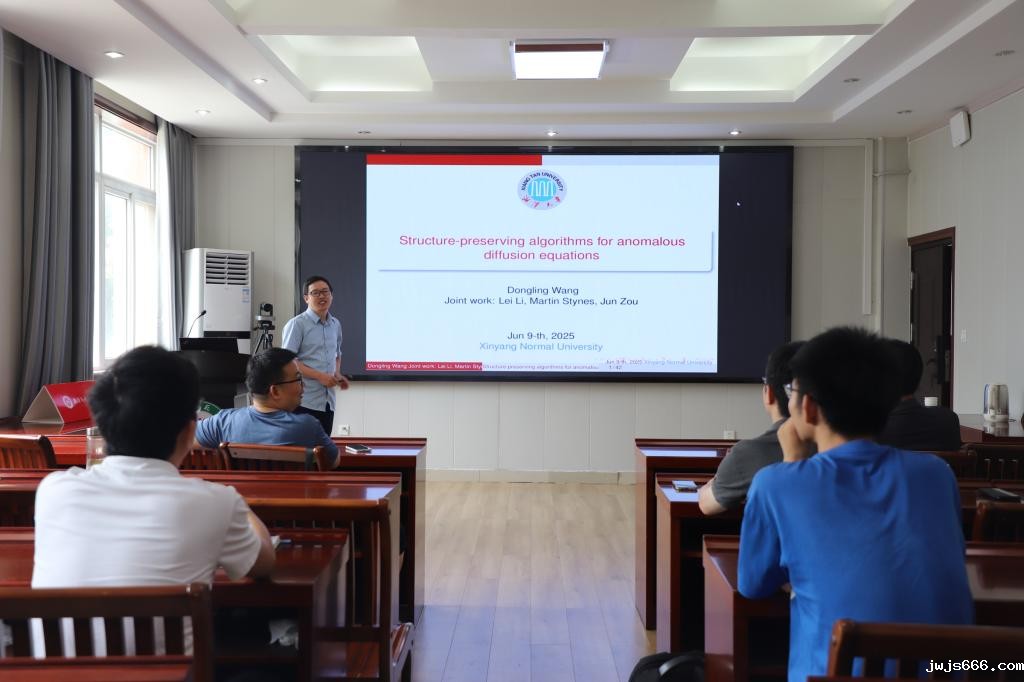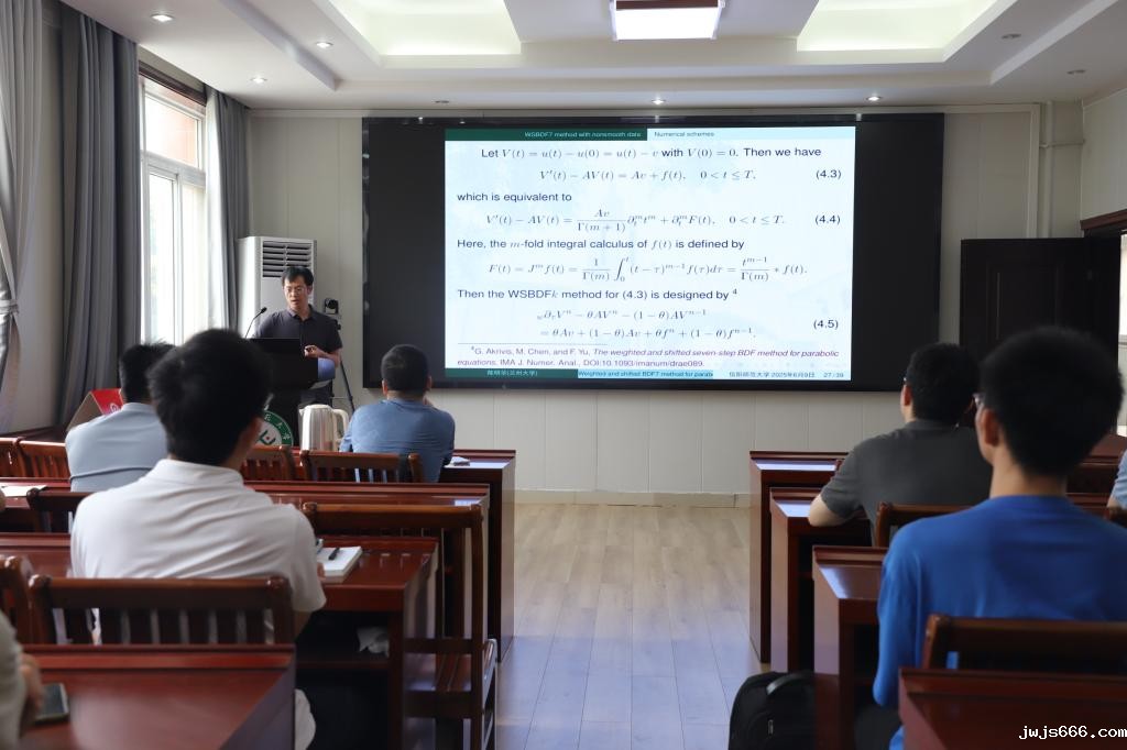 6月9日,应数学与统计学院邀请,兰州大学陈明华教授、上海科技大学廖奇峰教授、湘潭大学王冬岭教授分别作了题为《Weighted and shifted seven-step BDF for parabolic equations with nonsmooth data》《Reduced basis methods for parameterized PDEs》《反常扩散方程的保结构算法》的学术报告。报告会由李世顺教授主持,部分老师及研究生聆听报告。