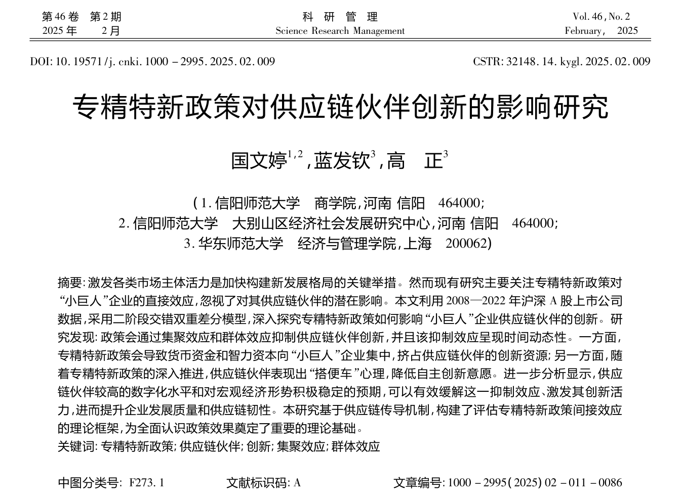 近日,商学院国文婷博士作为第一作者在管理学权威期刊《科研管理》2025年第2期上发表题为“专精特新政策对供应链伙伴创新的影响研究”学术论文。《科研管理》是国家自然科学基金委员会管理科学部认定的管理科学A级重要期刊,被五大检索库(CSSCI,北大核心,JST,CSCD,AMI核心)同时收录,为我校认定的一级权威期刊。